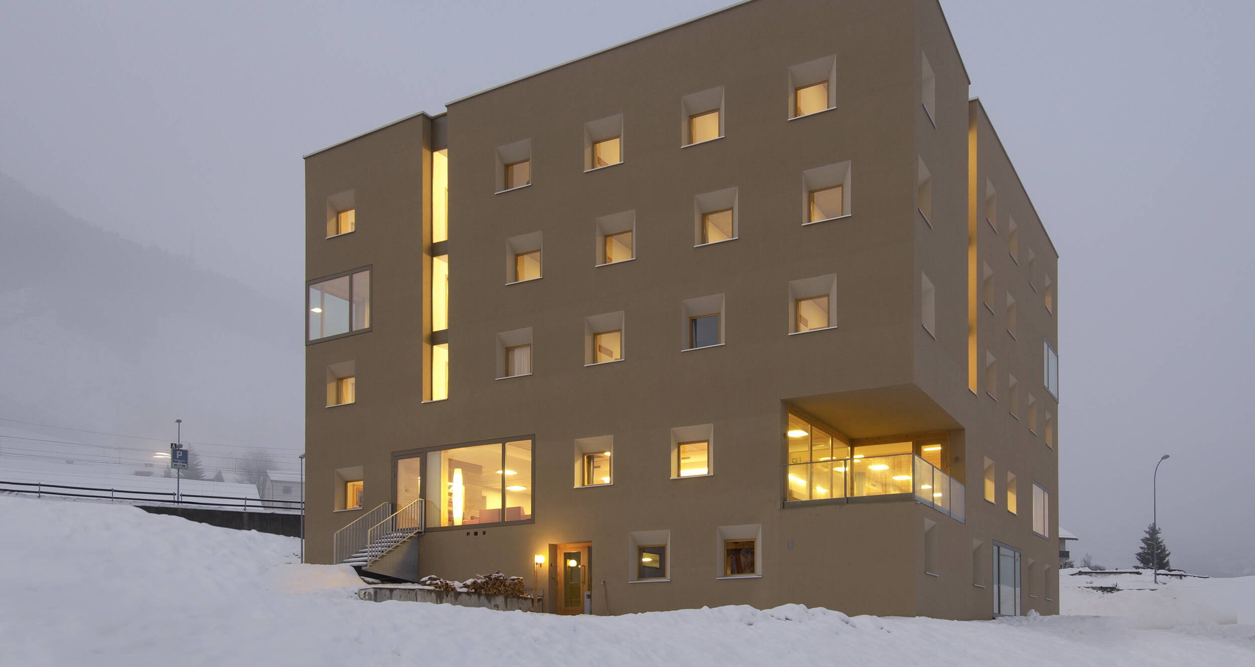 Wie ein Findling liegt der kompakte Kubus präzise gesetzt am westlichen Dorfeingang von Scuol. Die markanten Einschnitte und die traditionellen Trichterfenster, sowie die erkerförmig ausgebildeten Eckfenster ergeben abwechslungsreiche Ein- und Ausblicke. Einheimische Materialien und einfache, klare Details ergeben ein intensives Wohlgefühl und verbinden modernste Technik mit traditionellem Flair, ohne kitschig zu werden. Eine Luxusherberge für alle Junggebliebenen.