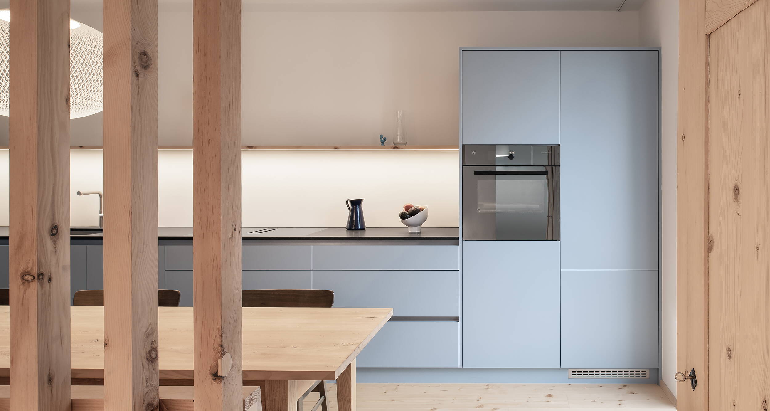 Eine versteckte Oase in der Stadt. Die Seele vom Haus, die gerade Treppe in der Mitte des Gebäudes, verbindet und trennt jeweils zwei Räume auf insgesamt vier Geschosse - und das mit nur 40 m2 pro Geschoss. Klein aber fein, mit dezente Farben und natürliche Materialien frönen wir das 30er-Jahre Feeling.